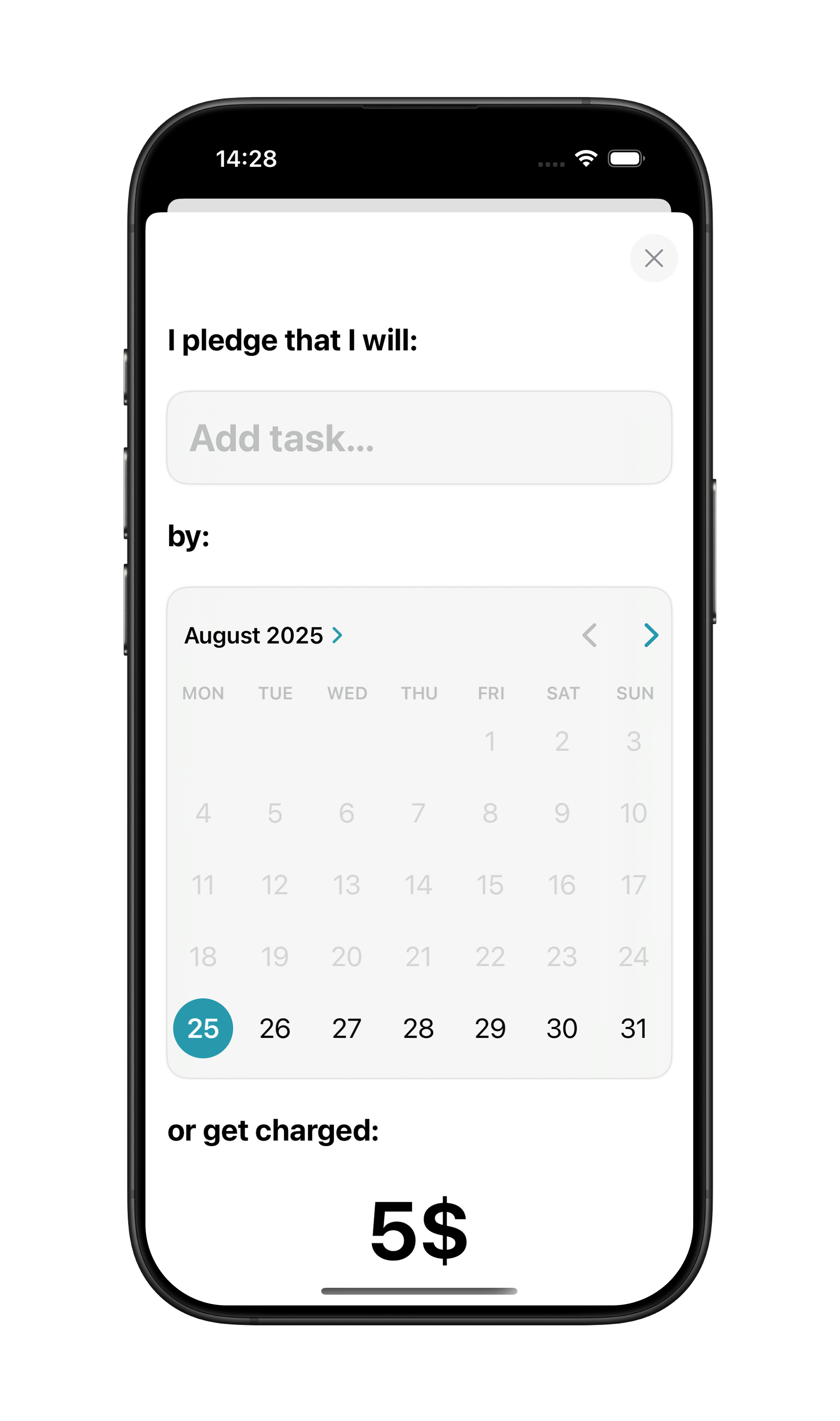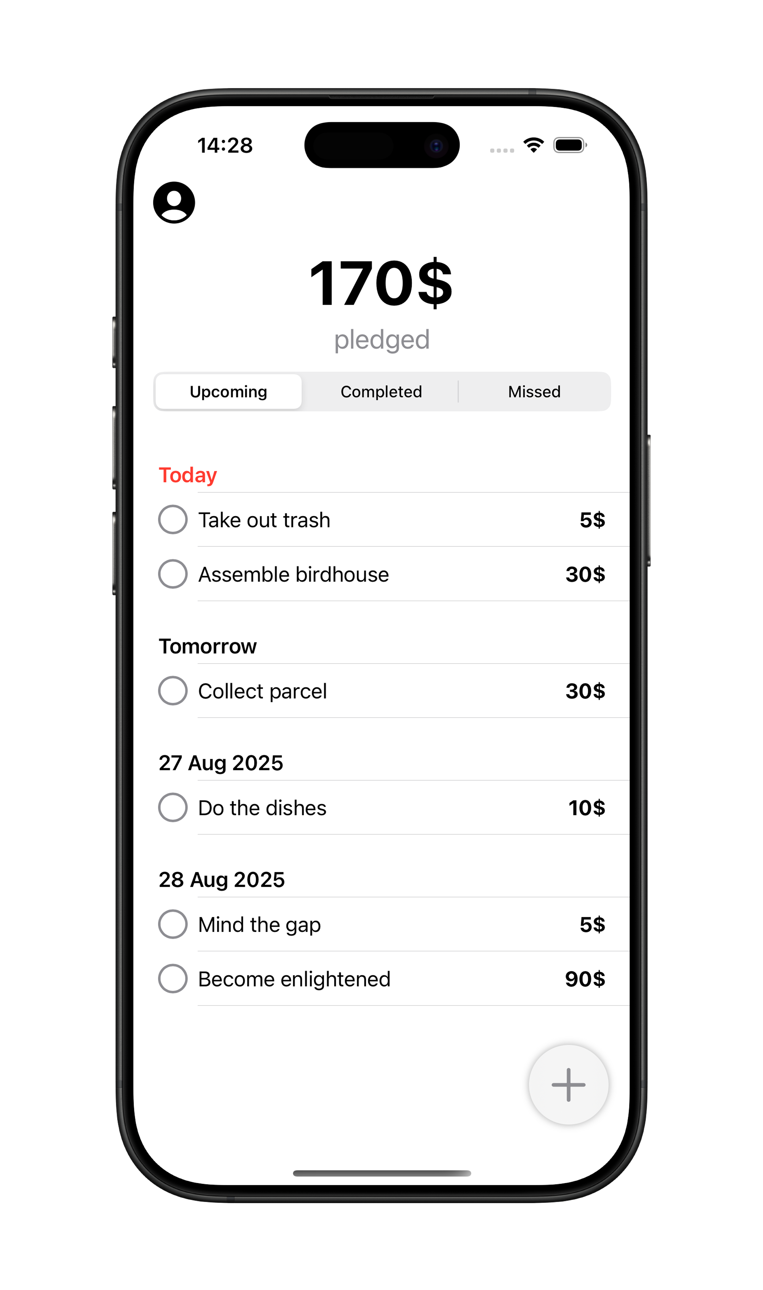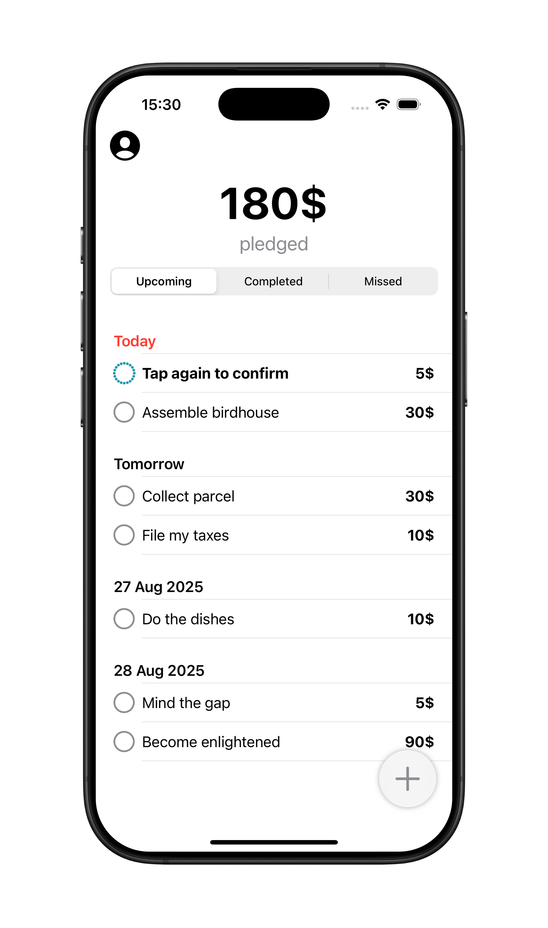 All your pacts can be seen in a single overview where you can mark them complete. When a pact is missed, your card will automatically be charged. Made a mistake? We will simply refund you.
